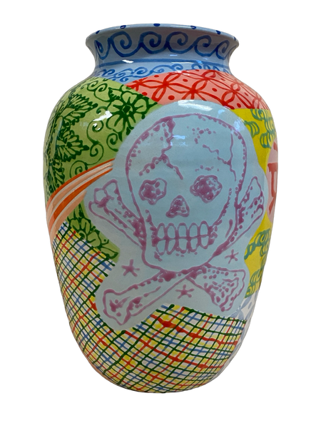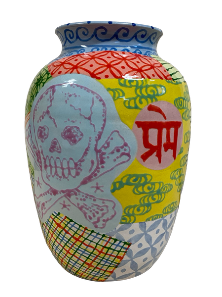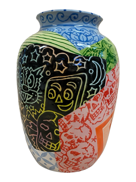 Adam Shrewsbury (b. 1984) is a self-taught ceramic artist based in Michigan. Since 2016, he has focused on creating handmade pieces with intricate surface decorations influenced by tattooing, spiritual studies, and pop culture. His work blends enigmatic elements to evoke nostalgia, curiosity, and a light-hearted view of the human condition. Adam's ceramics have been featured in galleries in NY, LA, and Paris, and are part of private collections globally.