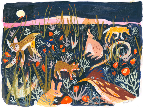 Melissa Lakey is a contemporary visual artist and illustrator based in Yucca Valley, California. Her colorful figurative and landscape-based works are inspired by the desert where she lives as well as a childhood of watching westerns and dreaming of becoming a cowboy.
