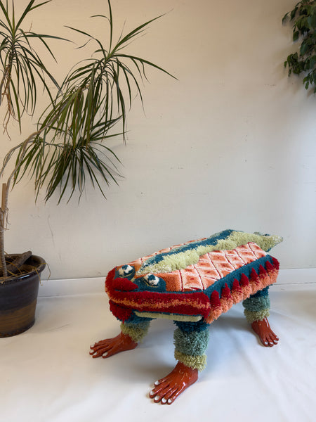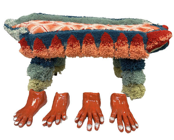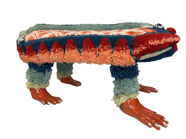 38” long x 18” wide x 18” tallhand made rug with %100 wool yarn hand sewn and upholstered on found wood bench4 ceramic feet 9" x 5" x 2"