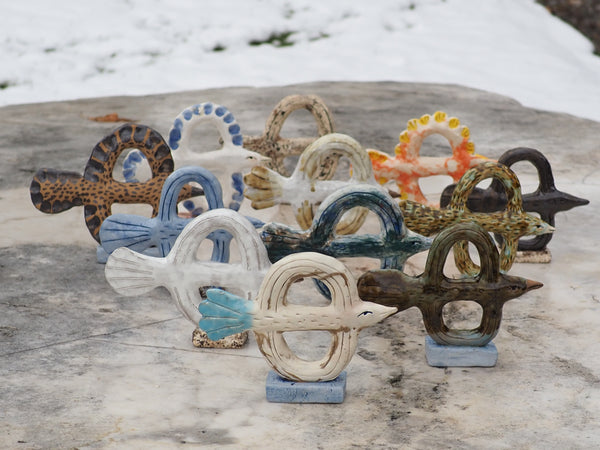 Made using a custom two-part press mold and then altered by hand after. Lili made this as part of a series of birds during her residency at Anderson Ranch in Colorado.